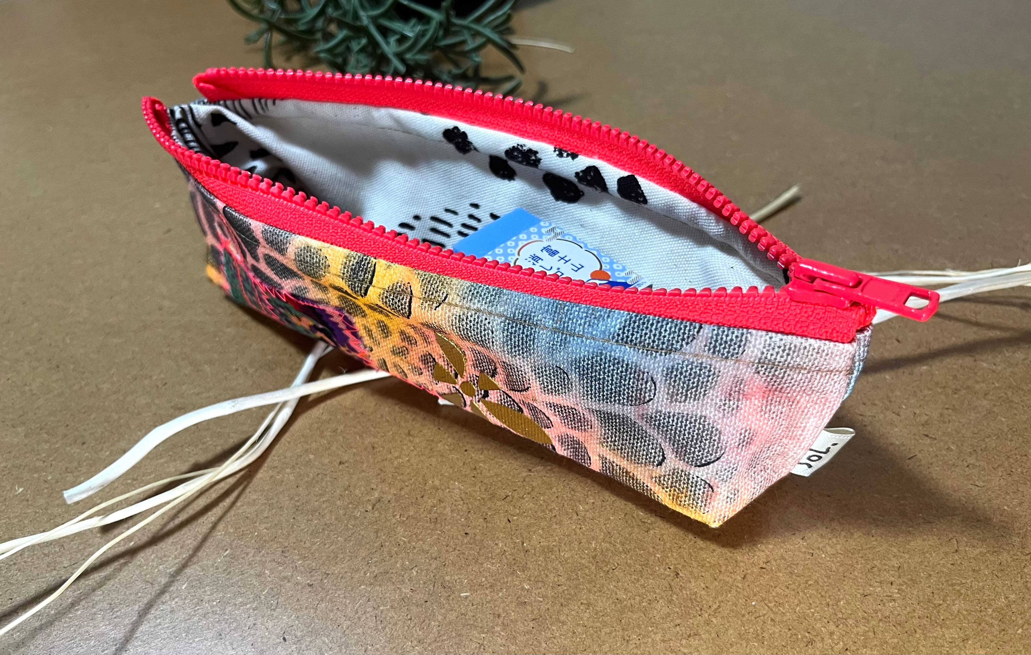 カラフルでユニークな世界のペンケースです。アクリル絵の具を使って模様を描いてます。布ワンポイントをつけ、そのままデザインになっています。